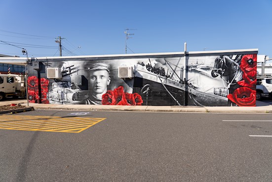The Gallipoli campaign is referenced through archival textures, illustrating one of Australia’s most defining and devastating military chapters. The landing boats, trench lines, and red poppies provide a visual language of remembrance and national identity.