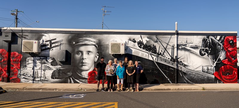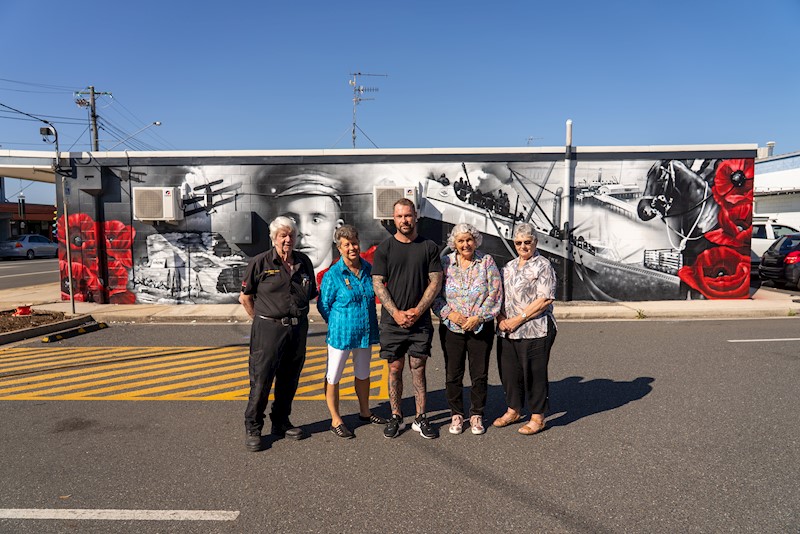 The surrounding imagery tells of Gladstone’s deep wartime connection. Troopships departed from Brisbane Harbour and the Gladstone Wharf used for export. Many never returned. Alongside them, hundreds of horses sent into service, never to come home. Their silhouettes represent both loyalty and loss, a powerful reminder of the lives changed by war.